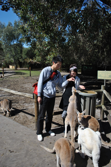有一大群的袋鼠~像是一群貪吃鬼~因為旁邊有免費的飼料桶~遊客可以自己拿來餵食~